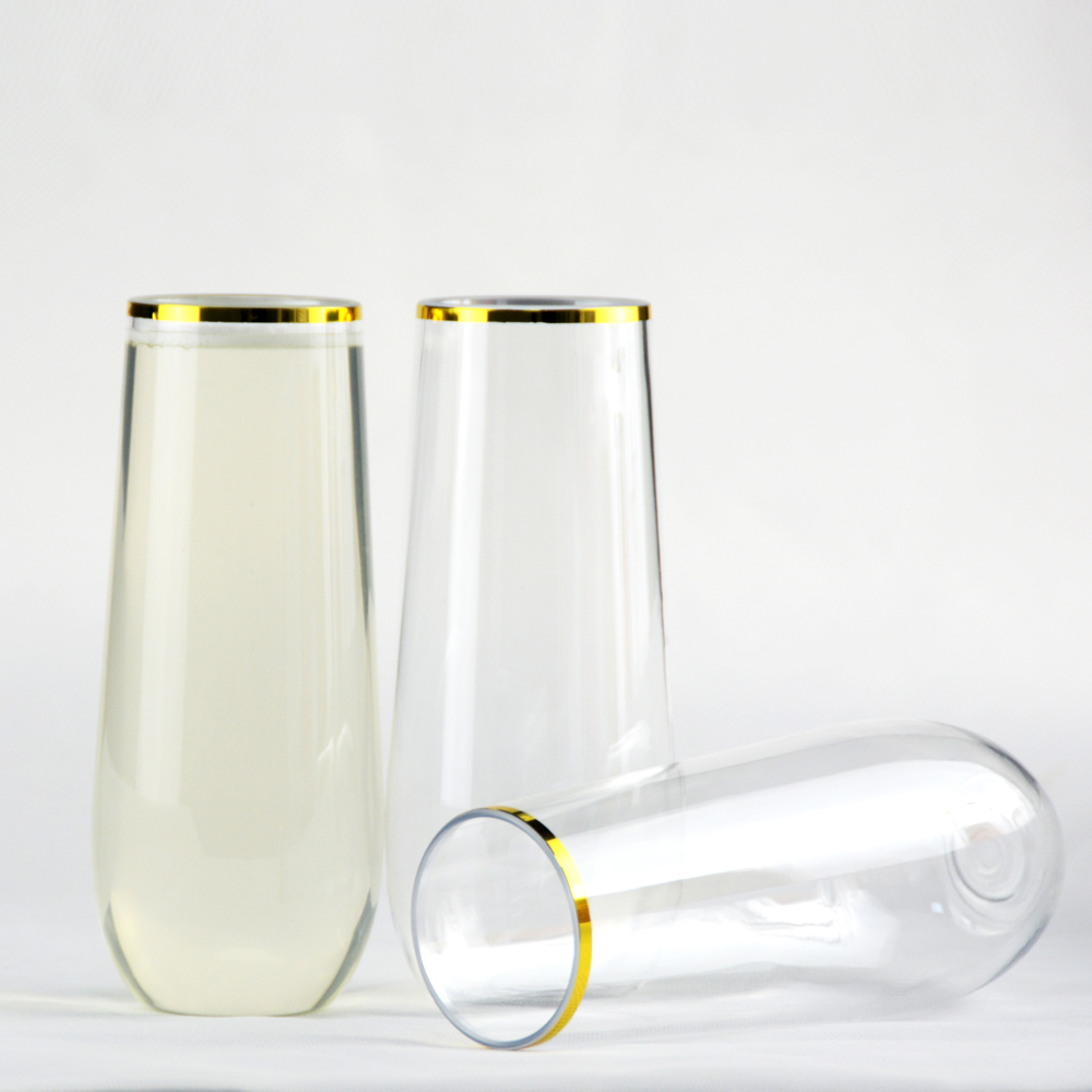 Iifluti zechampagne zegolide zeCharmlite zinokuphucula amava akho okusela ngeeglasi zewayini zeplastiki ezicacileyo. Iindebe zethu azibukeki nje kakuhle, ziziva kamnandi. Iirim ezijikelezileyo zokusela kamnandi, umzimba ongenazikhondo unqanda ukuncama kwaye uvumela ukuphefumlelwa kwewayini okanye isiselo ngaphakathi. Isixhobo sokukhusela i-shatterproof siyenza ibe yinto efanelekileyo kwiminyhadala ye-upscale efana namaqela eeholide, isidlo sangokuhlwa esisemthethweni, imibhiyozo elungiselelwe okanye naphi na apho ufuna ukuthintela umngcipheko weglasi eyaphukileyo. Isebenza ngeendlela ezininzi emanzini, ii-cocktails, i-lemonade, ijusi, okanye idizithi, zilula kwaye zilula ukubamba abantwana nabo!